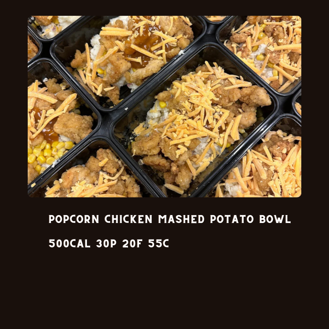 Hello comfort food! Mashed potatoes, corn, gravy, white meat popcorn chicken topped with a sprinkle of cheese.